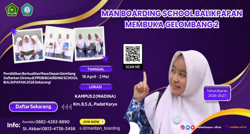 Kesempatan kembali dibuka! MAN Balikpapan mengundang siswi-siswi terbaik untuk bergabung dalam lingkungan belajar yang islami, disiplin, dan berprestasi di program Boarding School (Asrama) Khusus Putri.